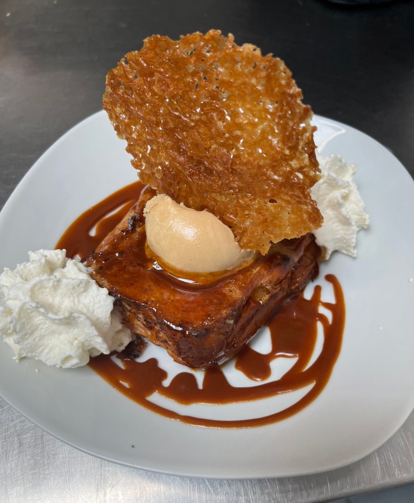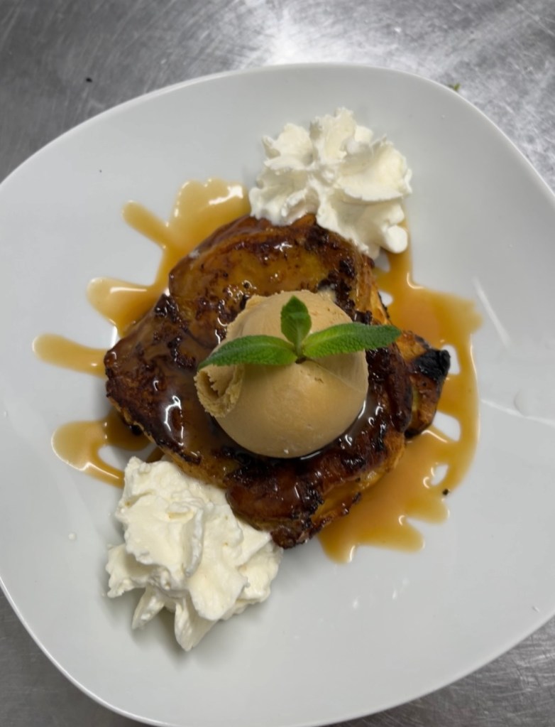 Brioche perdue au caramel accompagnée d’une boule de glace caramel beurre salé